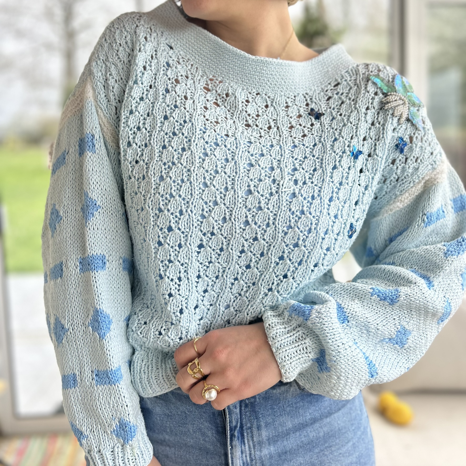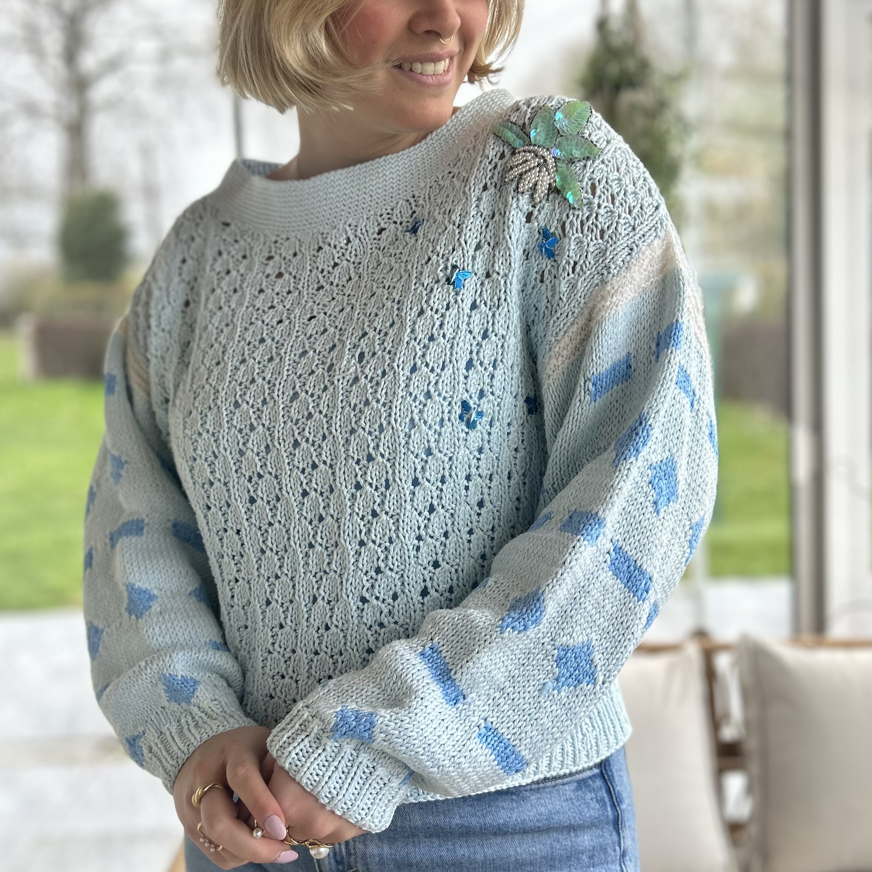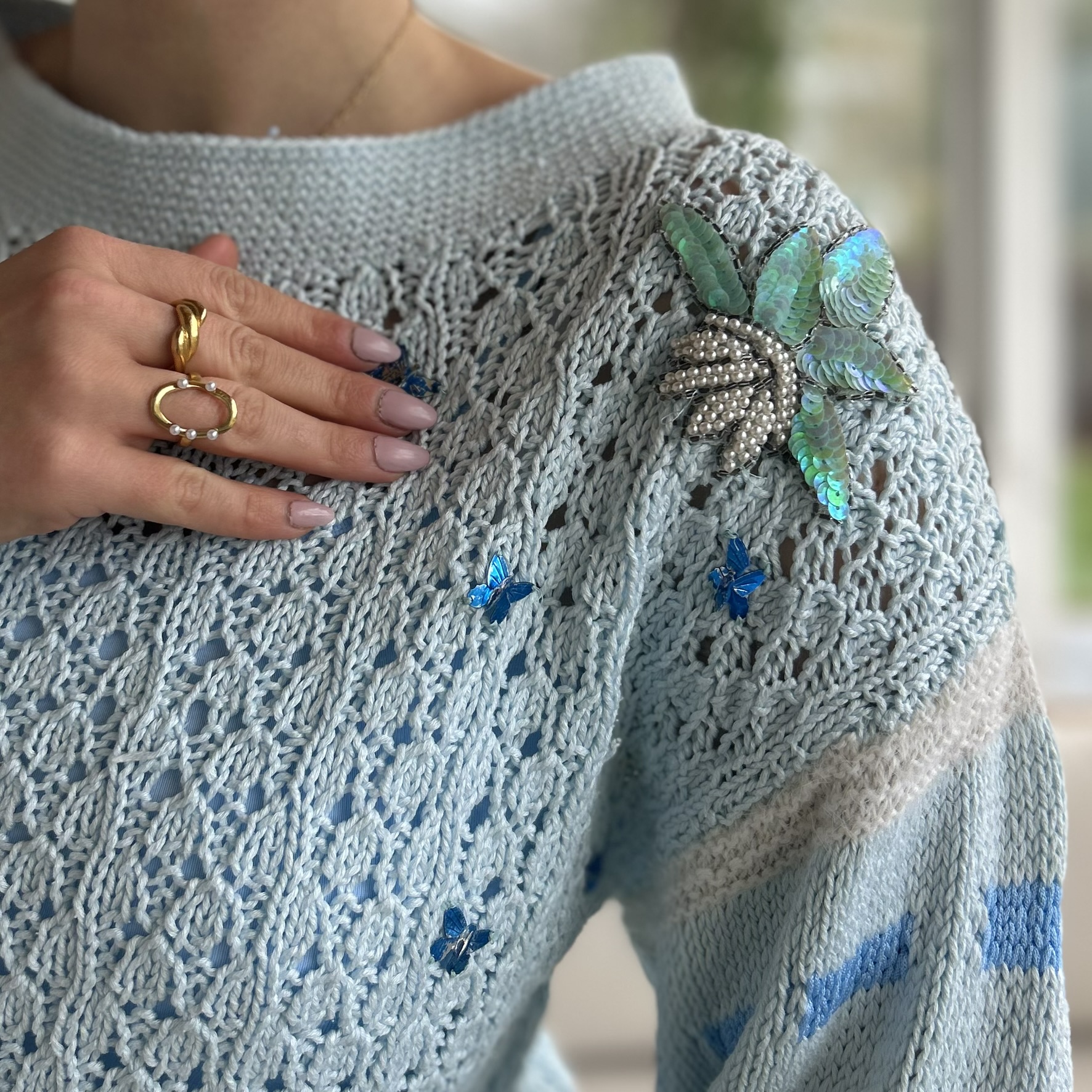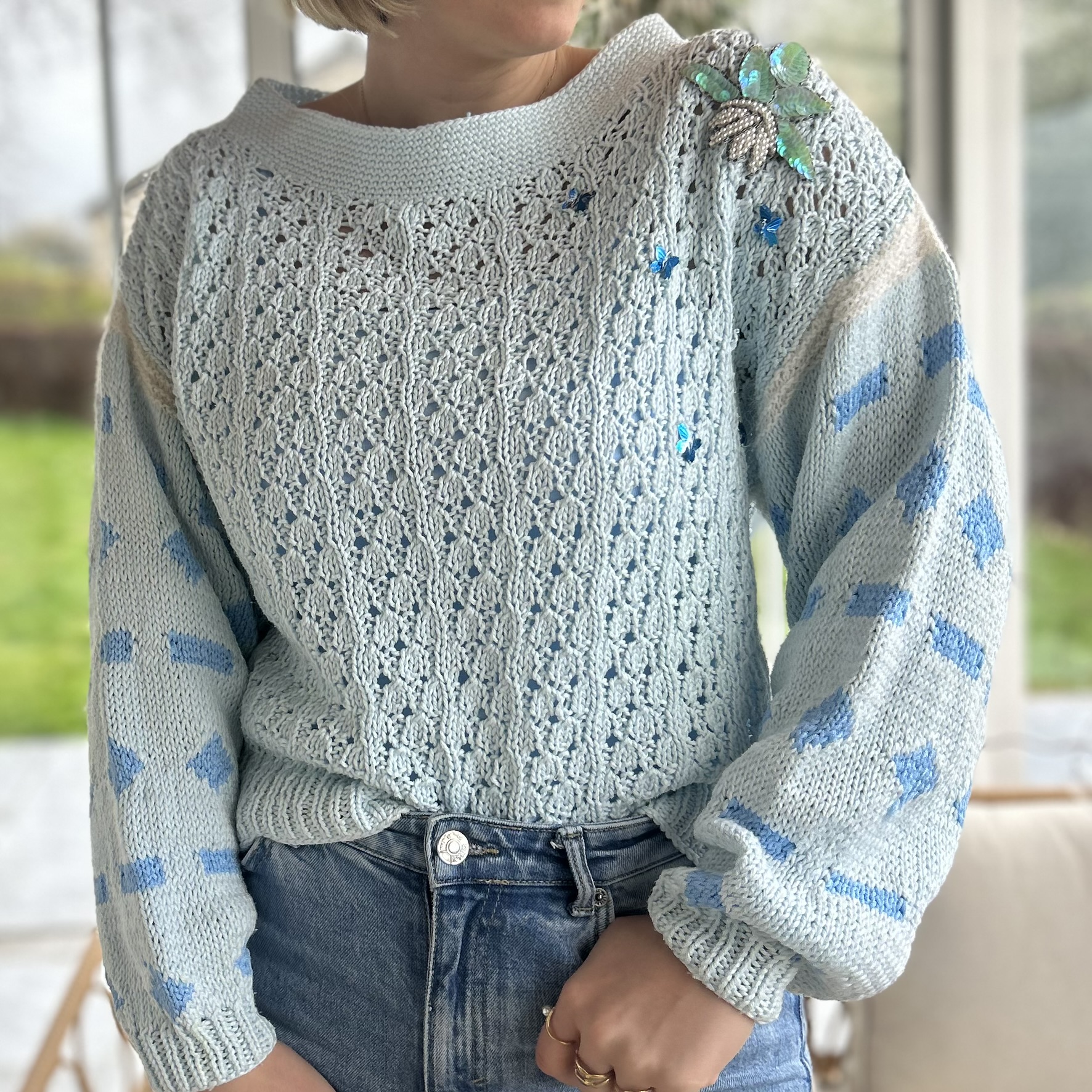 Pull Vintage fait main. Strass fleurs et papillons. Couleur comme sur les photos. Col bateau